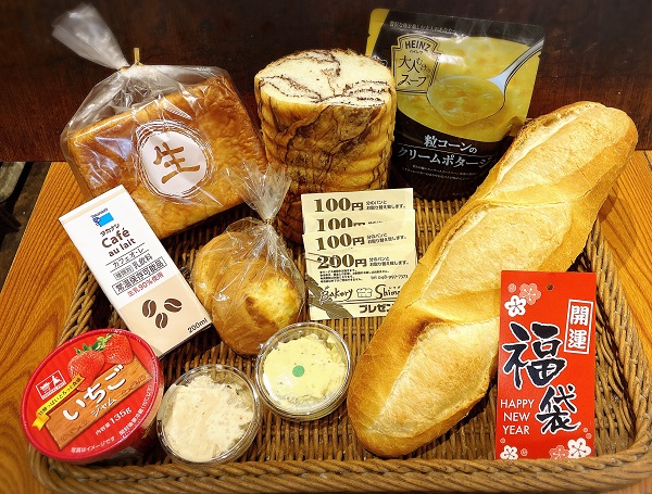 バタール、生食パン、ラウンドハーフ、スープ、焼き菓子、ドリンク、ジャム、ガーリックマーガリン、ピーナッツクリーム、金券。